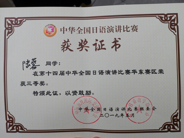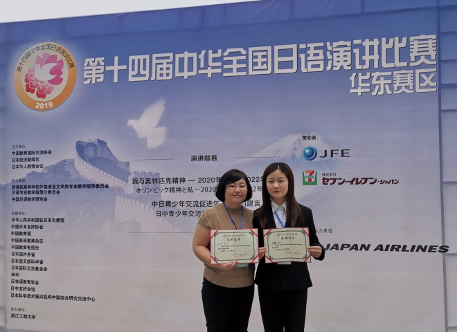 比賽分命題演講和即席演講兩部分。上午,選手們圍繞“我與奧林匹克精神——2020年東京,2022年北京”“中日青少年交流促進年——我的建言”兩個主題,開展了限時5分鐘的命題演講。選手們演講內容貼近生活實際,抒發了真實感悟,用真誠打動觀眾,以演講注解心聲。下午為限時3分鐘的即興演講,選手們圍繞“從古代的智慧中能學到什么”的主題展開演講。即興演講考驗的是選手們的知識儲備量以及臨場應變能力,比賽更顯激烈、緊張。我校選手陸蓉以扎實的語言功底和較強的臨場應變能力獲得三等獎,崔明姬老師獲優秀指導教師獎。