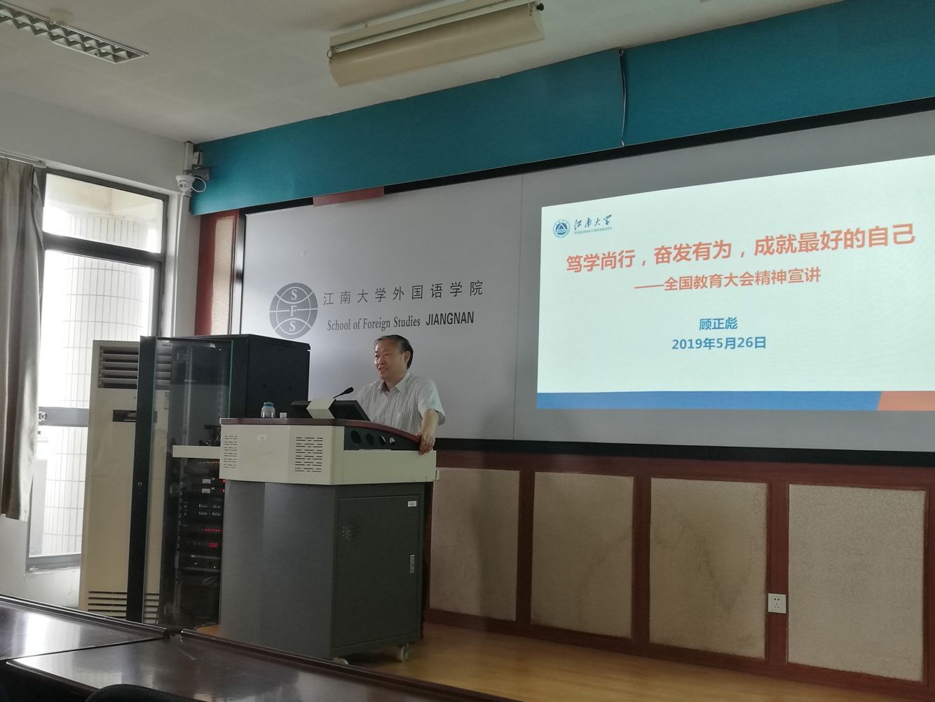 2019年5月26日下午,js3333線路檢測中心副校長顧正彪教授走進2C618教室,給外國語學院17級、18級本科學生150余名同學講授了一堂主題為“篤學尚行,奮發有為,成就最好的自己——全國教育大會宣講”的形勢與政策課。學院黨委副書記劉伯賢、分團委書記楊艷、分團委副書記張圓到場聽課。