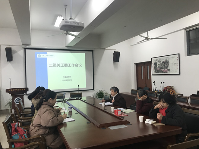 江南大學外國語學院二級關工委工作會議于2018年1月3日下午2:00在學院樓A349順利召開。學院關工委主任趙瑩,副主任張曉虹,鮑國慶、吳艷敏、許廣玉等全體委員參加了此次會議。會議由關工委主任趙瑩主持。