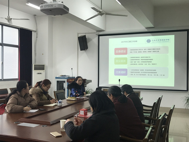 會上,楊艷老師介紹了外國語學院2018年二級關工委機構設置情況,并從自身建設、落實載體、注重調研、工作反思等四個方面作了2017年關工委工作小結。她指出黨政重視、齊心協力是育人工程的基礎,建設一支骨干隊伍是關工委工作落到實處的保證,而不斷開拓、創新工作則是關鍵所在。