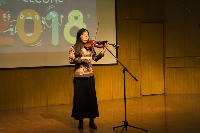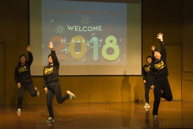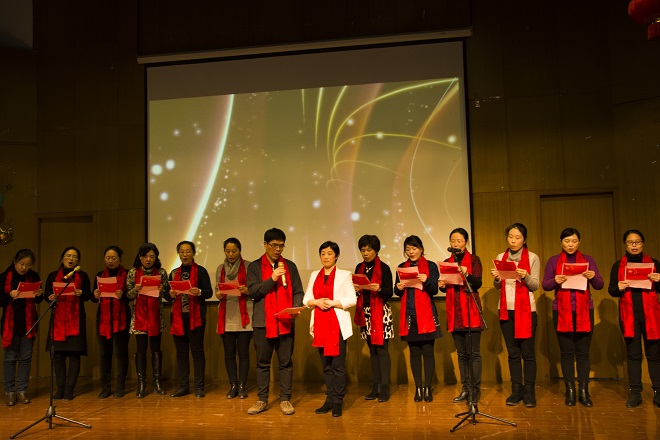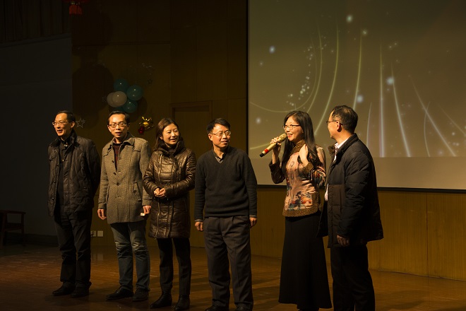 經過一個月的籌備,老師們利用業余時間,充分發揮各自的聰明才智,以組織課堂教學的認真態度,通過網絡等多渠道的學習,利用學校人文專業的資源,研究了服裝、道具、配樂等舞臺效果。節目的上演便如同考試,也被視作“我們自己的春晚”,大家都分外投入。節目形式多樣,舞蹈、朗誦、合唱,有西洋樂器演秦,也有傳統快板的敲擊。參與演員,有外籍老師,有師生同臺,有即將退休的年長同志,也有剛入職首次亮相的青澀新人,有頭發稀少的教授,也有身姿優美的麗人。每個人既有演出,也當觀眾,學院中層干部紛紛登臺,臺上臺下熱情互動,情誼交融,活動圓滿成功。