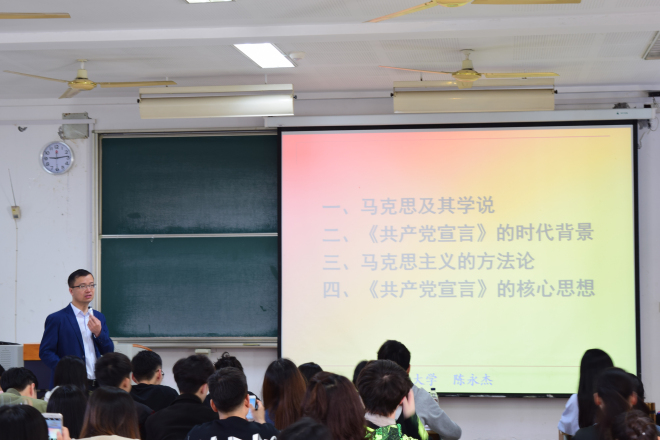 接著,陳永杰老師為我們上了一堂有趣生動的馬原課——如何理解《共產黨宣言》。課上,陳老師講授了《共產黨宣言》的背景及核心思想,馬克思主義的方法論和理論體系。此外,陳老師談到“己所不欲,勿施于人”是黨員的標準,全心全意為人民服務并不是要完全放棄自己的個人利益,每個人的自由發展是一切人的自由發展的條件。他指出,所有學員,作為發展對象,應該加強黨的組織觀念,必須堅守黨的信仰,堅定地為實現黨的目標而奮斗。
