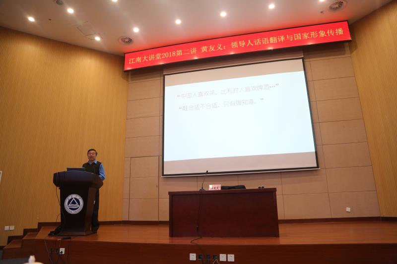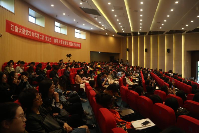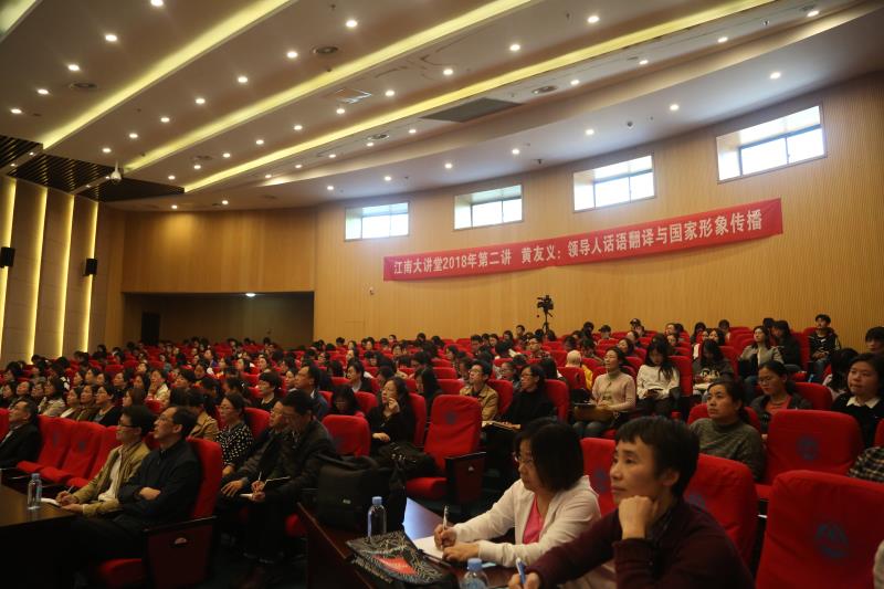 4月9日下午三點,國務院學位委員會委員、全國政協外事委員會委員、中國外文局前副局長、中國譯協常務副會長黃友義先生在js3333線路檢測中心遠東報告廳作了題為“領導人話語翻譯與國家形象傳播”的學術講座。此次講座既是校黨委宣傳部組織的2018年“江南大講堂”的第二講,也是外國語學院獻禮js3333線路檢測中心60周年校慶的外語學科系列講座之一,我校三百多名師生與無錫部分其他學校教師與社會人士參加了此次學術講座。