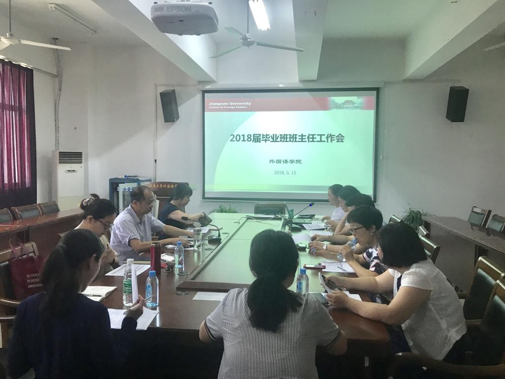 5月15日下午,外國(guó)語(yǔ)學(xué)院在A349會(huì)議室召開(kāi)2018屆畢業(yè)班班主任工作會(huì)議。院黨委副書(shū)記劉伯賢主持會(huì)議,教學(xué)副院長(zhǎng)方文開(kāi)、畢業(yè)年級(jí)輔導(dǎo)員楊艷以及全體畢業(yè)班班主任老師參加會(huì)議。