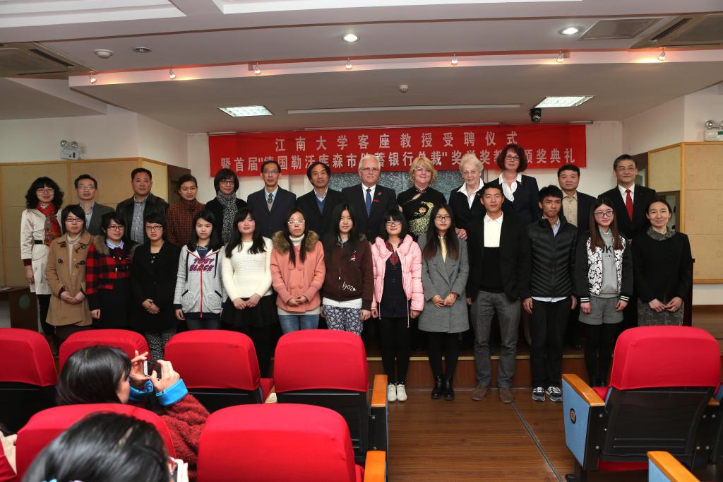 22日下午受聘典禮在文浩館205報告廳隆重舉行,出席此次儀式的領導和嘉賓有js3333線路檢測中心副校長金征宇、德國勒沃庫森市儲蓄銀行總裁曼弗雷德·赫博斯海姆先生一行,無錫市外辦副主任詹熠,js3333線路檢測中心人事處處長張影陸、國際交流處處長鐘芳、社會資源處處長林云鑒、外國語學院黨委書記黃城芳、黨委副書記趙瑩。儀式由外國語學院院長龔曉斌主持,外國語學院的部分師生代表也參加了此次活動。