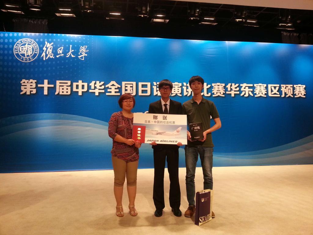 2015年06月13日,第十屆中華全國日語演講比賽華東賽區預賽在復旦大學舉行,來自復旦大學、上海交通大學、上海外國語大學、浙江大學、南京師范大學、南昌大學等華東地區21所高校的參賽選手經過激烈角逐,共有8名同學獲得不同獎項。我校2013級日語專業陳天泓同學發揮出色,力克華東地區多位名校的優秀代表選手,最終以優異的成績獲得了特等獎,崔明姬老師也獲得了優秀指導教師獎,為我校爭得了榮譽。這是日語系學子在該項賽事中取得的第二次特等獎。