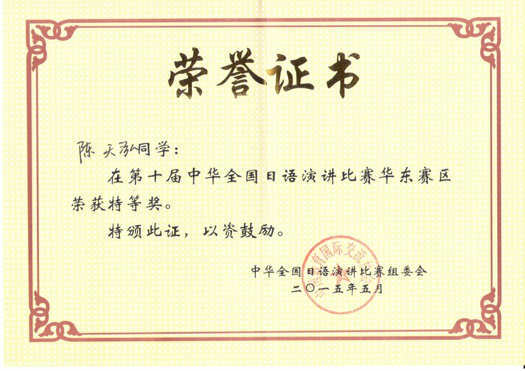 陳天泓同學將代表華東賽區于7月赴東京參加決賽,在此祝愿他繼續取得好成績!