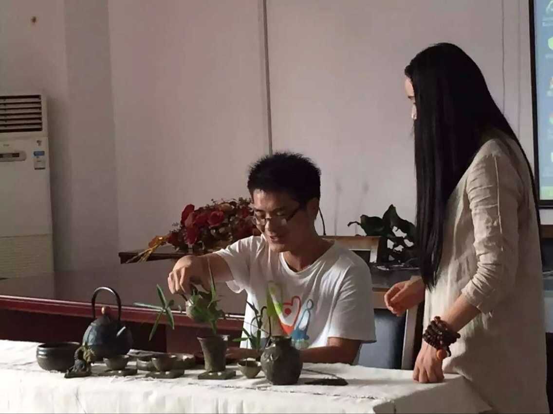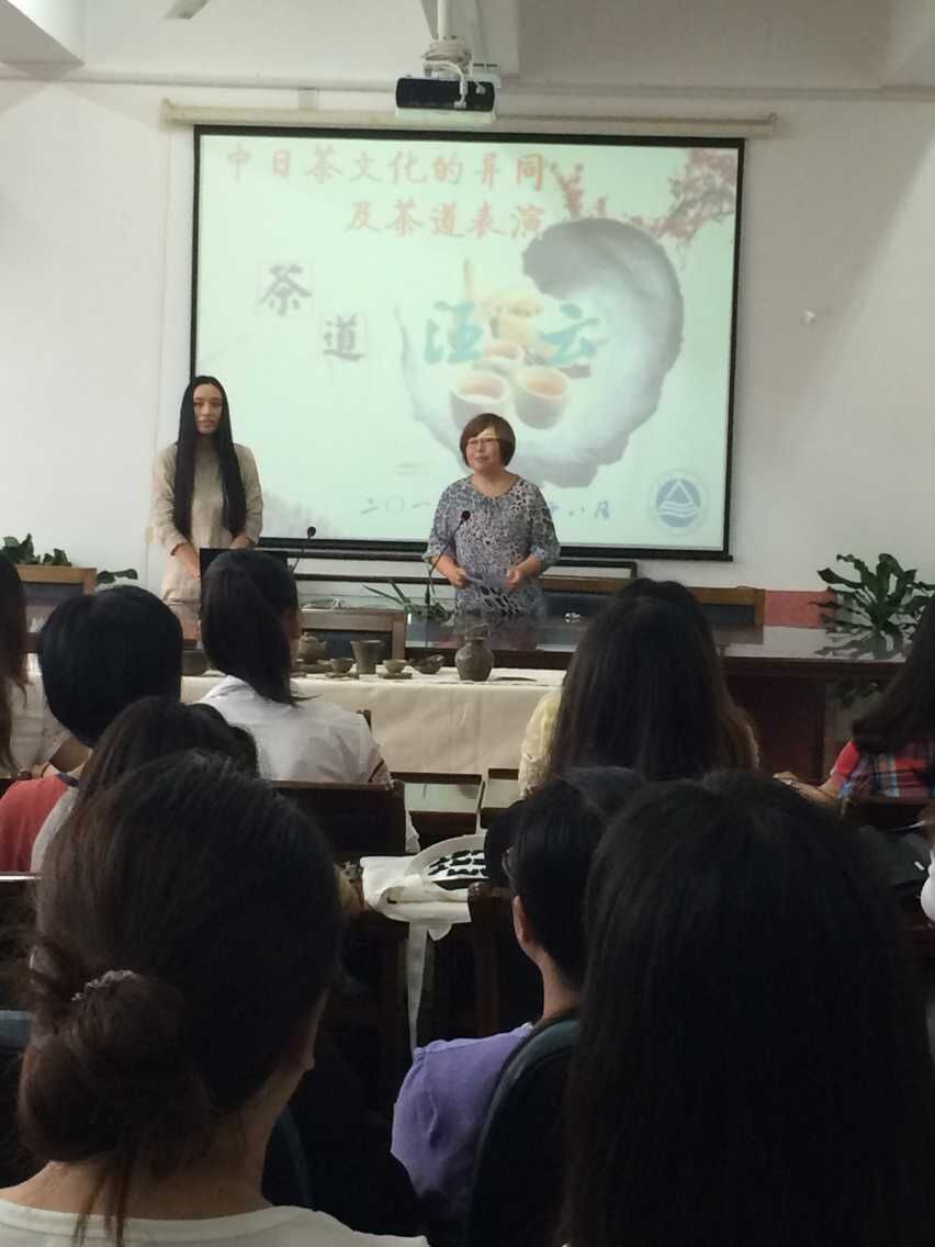 汪老師用ppt詳細講解了中日韓茶道的異同,使在場的同學深刻領會到茶道所傳遞出的禪境,并加深對生活、自然的領悟。汪老師還結合自己長期的茶文化交流經驗,告訴同學們日本與韓國的茶道重視形式,但是內容很空洞,中國的茶藝雖沒有日韓那么復雜,但是使觀眾更能產生一種大氣的感覺,與其說重其形式,不如說在做茶道時更重視自己內心的感悟,在那行云流水的步驟中,平靜自己的內心,感悟自己周邊的一切。