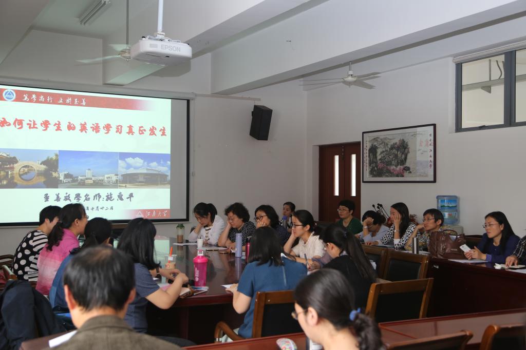 參與此次活動的教師也與施老師展開了積極的互動。對于教師們提出的問題,施老師均一一耐心解答。施老師在交流中也強調:作為一名教師,課堂上你可以給學生示范,但更重要的是賦予學生更多的責任,讓學生學會自主學習。教師在逐漸釋放責任的過程中,教學內容的設計一定要對學生具有挑戰性,同時符合學生的興趣,讓學生有更多的機會真正參與課堂教學。教師也要通過表揚、鼓勵、督促、檢查等多管齊下的方法激發班里每一位學生的學習興趣和動機,讓學生真正感受到英語語言的魅力和英語學習帶來的樂趣,從而在短期內取得明顯的英語學習進步。