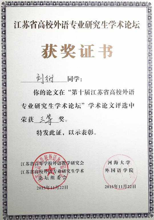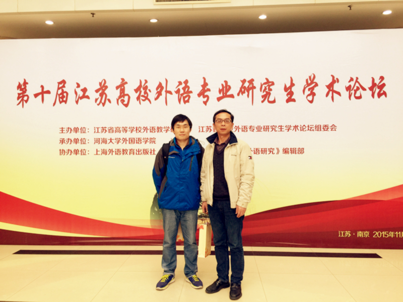 2015年11月20至22日,由江蘇省高等學(xué)校外語(yǔ)教學(xué)研究會(huì)和江蘇省高校外語(yǔ)專業(yè)研究生學(xué)術(shù)論壇組委會(huì)主辦、河海大學(xué)外國(guó)語(yǔ)學(xué)院承辦的第十屆江蘇高校外語(yǔ)專業(yè)研究生學(xué)術(shù)論壇在河海大學(xué)舉行。來(lái)自省內(nèi)20余所高校的200余名專家學(xué)者、博士、碩士研究生匯聚一堂,我院方文開(kāi)教授帶領(lǐng)2014級(jí)研究生劉衍參加了此次論壇。