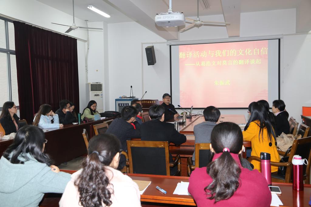 12月10日下午,上海大學博士生導師朱振武教授應邀在外國語學院大會議室做了題為“翻譯活動與我們的文化自信—從葛浩文對莫言的翻譯談起”的學術講座。方文開副院長主持了講座,我院數十名中青年教師和14級碩士研究生聆聽了講座。