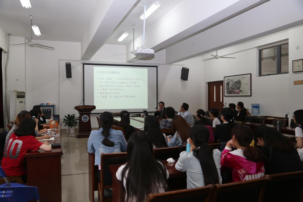 在領略了十六世紀英國文學經(jīng)典的風采后,張漢良教授又帶領師生們走進了符號學、哲學與美學相結(jié)合的殿堂。張教授以柏拉圖的《詭辯家》、亞里士多德的《論記憶》和賀拉斯的《詩辯》為例,講解了古典時代(公元前5-4世紀)的摹擬論,亞里士多德《創(chuàng)作論》的“詩藝”與“詩辯”,以及藝術(shù)別類之間的摹擬與“跨媒介符號學的興起。張教授指出,摹擬區(qū)別于模仿,摹擬是創(chuàng)作的動機和鑒賞的條件,摹擬的本能正是藝術(shù)的起源。摹擬作為一個藝術(shù)總類,是亞里士多德《創(chuàng)作論》的核心概念。