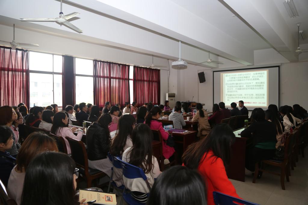 4月27日下午,外國語學(xué)院A349會議室座無虛席。上海外國語大學(xué)博士生導(dǎo)師張健教授應(yīng)邀為我院師生作題為《走出外宣翻譯的誤區(qū)》的精彩講座,講座由外國語學(xué)院翻譯團隊負責(zé)人王金安教授主持。外國語學(xué)院翻譯團隊全體教師、英語系全體教師、大學(xué)外語拓展部與基礎(chǔ)部部分教師與部分研究生聆聽了講座。本次講座還有來自無錫市外辦、無錫市翻譯協(xié)會、無錫太湖學(xué)院的部分教師參加。