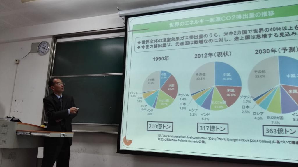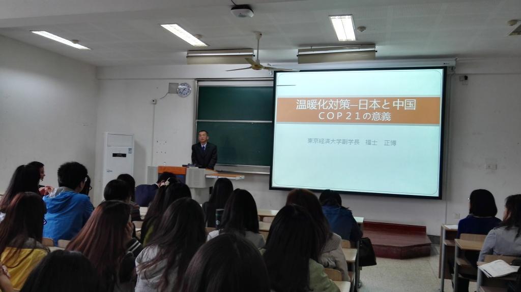 2015年11月4日,在我校二教舉辦“關(guān)于全球氣溫變暖及其應(yīng)對措施”的講座。這次講座邀請了東京經(jīng)濟(jì)大學(xué)福士正博教授及校方代表,由外國語學(xué)院日語系崔明姬老師主持,為日語系全體師生帶來精彩的一課。