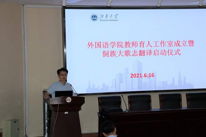 侗族大歌系流行于貴州從江縣的傳統音樂,2009年被聯合國教科文組織列入人類非物質文化遺產代表作名錄。侗族大歌志翻譯項目是學校定點幫扶貴州從江一攬子扶貧計劃的一部分,已列入學校即將召開的脫貧攻堅表彰大會的議程,作為學校下一階段鞏固拓展脫貧攻堅成果全面推進鄉村振興計劃的重要工作安排。學院黨委書記史志洪強調,這個項目是學校黨委交給我們的一項光榮的政治任務,也是剛剛成立的“譯見中情”教師育人工作室進行文化外宣、講好中國故事的重要載體和抓手,更是我們外國語學院充分發揮專業特長,服務國家戰略的具體舉措,我們要集全院之力,不折不扣,按時保質完成相關工作。