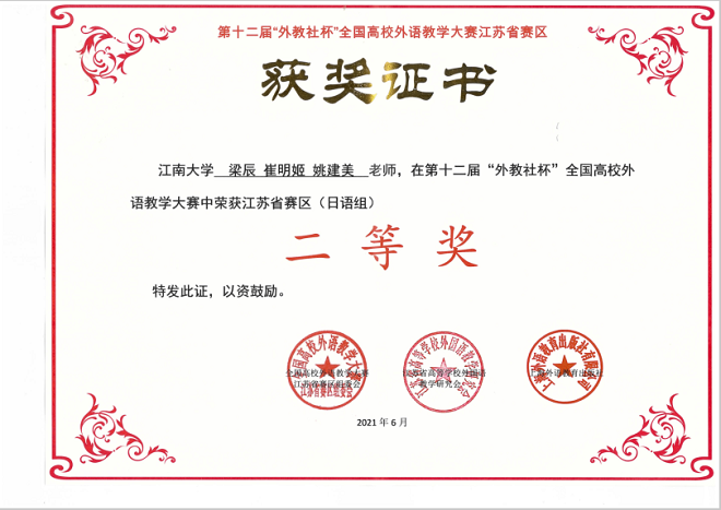 在剛剛結束的第十二屆“外教社杯”全國高校外語教學大賽江蘇省賽區的比賽中,我院日語教學團隊榮獲二等獎,這是日語教學團隊首次在省級教學比賽中獲得佳績,為日語教學團隊參與教學比賽取得突破進展。