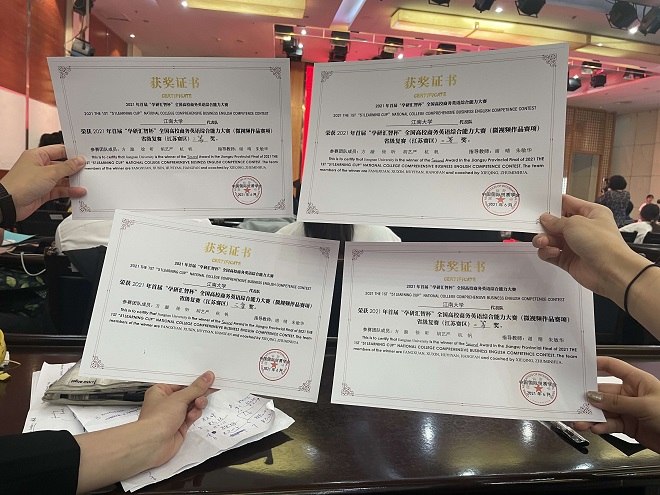 js3333線路檢測(cè)中心代表隊(duì)“102商英小隊(duì)”在js3333線路檢測(cè)中心初賽中脫穎而出,代表學(xué)校參加復(fù)賽。在謝晴和朱敏華老師的精心指導(dǎo)下,參賽選手賽前進(jìn)行了充分的準(zhǔn)備和演練,包括前期的微視頻制作、賽前的PPT設(shè)計(jì)以及打磨熟記演講稿,最終選手們?cè)谝曨l制作、知識(shí)競(jìng)賽以及現(xiàn)場(chǎng)賽中表現(xiàn)優(yōu)異,獲得省級(jí)復(fù)賽(江蘇賽區(qū))二等獎(jiǎng)。此次比賽鍛煉了參賽學(xué)生的英語(yǔ)應(yīng)用能力、跨文化交際能力和“商務(wù)+英語(yǔ)”的復(fù)合型能力,同時(shí)也為培養(yǎng)學(xué)生提高商務(wù)英語(yǔ)綜合素質(zhì)、以賽育人、思政育人以及商務(wù)英語(yǔ)課程教學(xué)留下寶貴經(jīng)驗(yàn)。