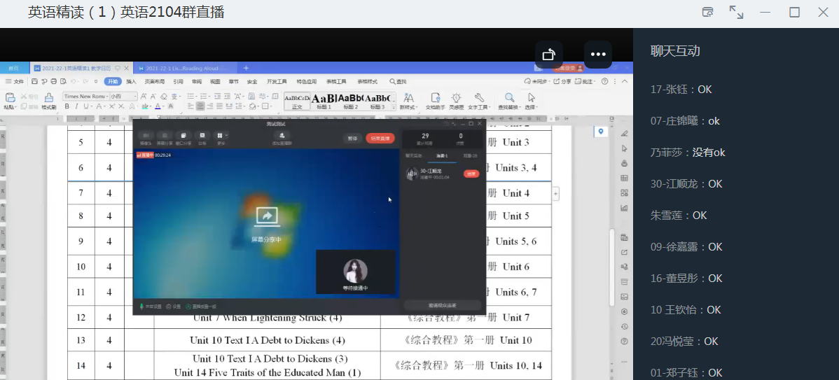 英語系積極響應,提前謀劃,在總結以往在線教學經驗的基礎上,各課程組根據課程特點和學習方式的不同,大膽探索,勇于嘗試,尋求最適合的線上教學方式。8月26日,學院對所有教師進行釘釘平臺的在線教學培訓。通過金波和姜辰娟兩位老師的培訓,大家全面“復習”了釘釘平臺的直播基本操作,并了解了釘釘平臺新開發的視頻會議“課堂直播”功能。培訓完成后,系部立即展開了線上教學群體的組建。在兩天內,老師們共搭建了109個線上教學主要群體,每個教學班還配備了備用教學平臺,以應對可能出現的意外情況。