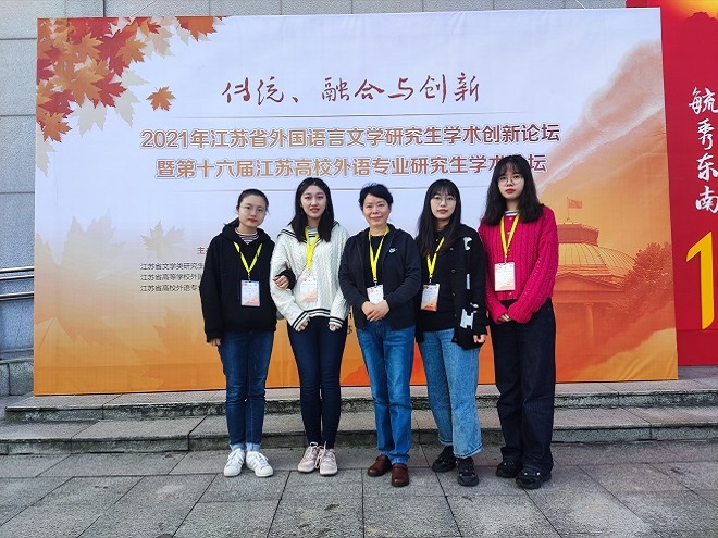2021年10月23日,2021年江蘇省外國語言文學研究生學術創新論壇暨第十六屆江蘇高校外語專業研究生學術論壇在東南大學召開。本屆論壇由江蘇省文學類研究生教育指導委員會、江蘇省高等學校外國語教學研究會和江蘇省高校外語專業研究生學術論壇組委會主辦,由東南大學外國語學院承辦。本次論壇采取線上線下結合的方式,來自省內20余所研究生培養單位的近200名碩博研究生與帶隊教師線下出席了本次學術交流會議,同時,部分專家由于疫情防控采取了線上參會的方式。我院四名20級碩士,即曹玥、彭丹、袁詠雪、張夢蘭在嚴敏芬教授的帶領下參與了本次論壇。