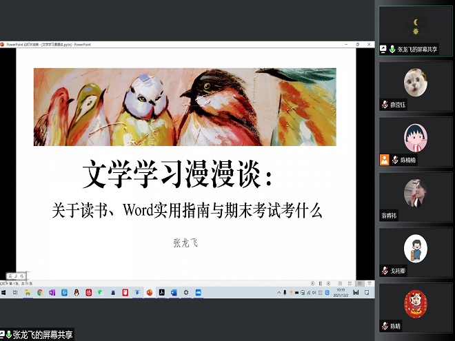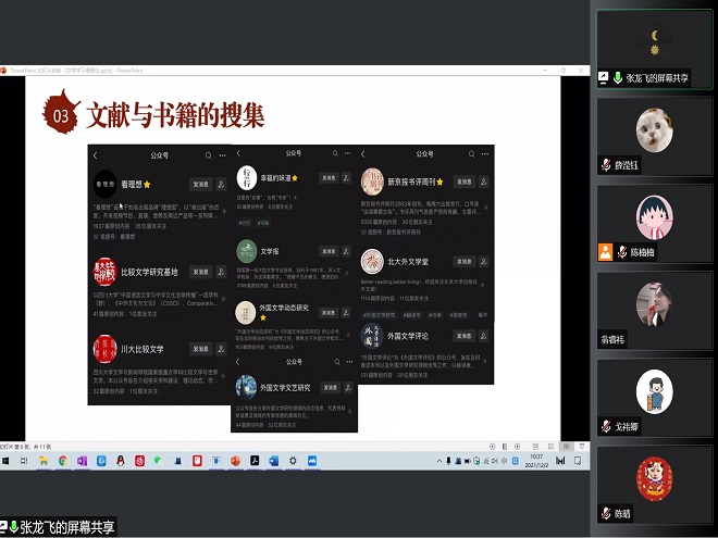 張龍飛同學(xué)以“文學(xué)學(xué)習(xí)漫漫談”為主題,圍繞“讀書(shū)”和“Word實(shí)用指南”兩個(gè)方面分享了自己的經(jīng)驗(yàn)。在談讀書(shū)時(shí),他首先針對(duì)選題給出了多與老師溝通與廣泛閱讀的建議,接著從哲學(xué)、文論和小說(shuō)三方面給出了推薦書(shū)目和閱讀建議,并以O(shè)neNote為例向大家演示了如何做好讀書(shū)筆記,然后為同學(xué)們推薦了與文學(xué)研究相關(guān)的微信公眾號(hào),如“外國(guó)文學(xué)動(dòng)態(tài)研究”、“外國(guó)文學(xué)評(píng)論”等,還推薦了Z-lib、LoreFree等圖書(shū)搜索網(wǎng)站。