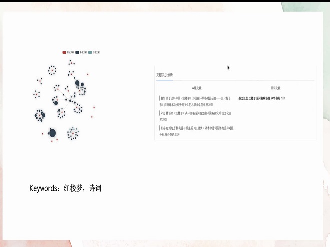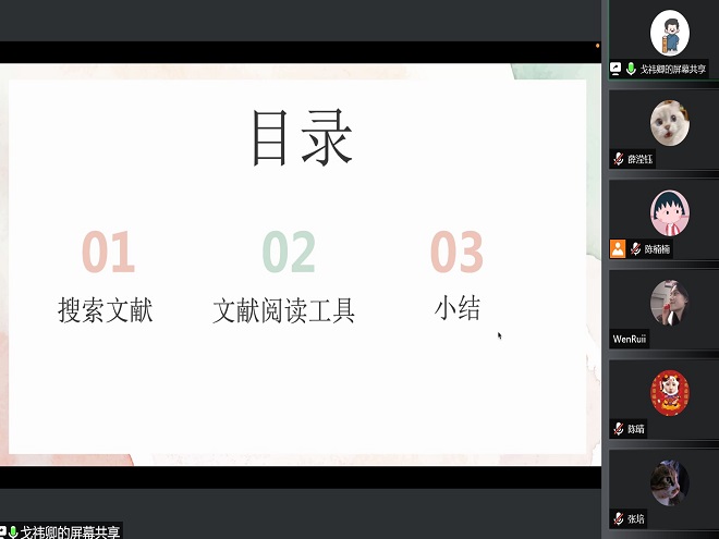 戈祎卿同學(xué)以“文獻(xiàn)閱讀方法分享”為主題,從“搜索文獻(xiàn)”和“文獻(xiàn)閱讀工具”兩個(gè)方面進(jìn)行了分享。在分享文獻(xiàn)搜索的相關(guān)經(jīng)驗(yàn)時(shí),她提醒同學(xué)們要注意選擇期刊,并對(duì)搜索結(jié)果進(jìn)行可視化分析,以甄別有價(jià)值和需要重點(diǎn)閱讀的文獻(xiàn)。此外,她為同學(xué)們推薦了Endnote這一文獻(xiàn)閱讀工具,并從軟件界面、文獻(xiàn)導(dǎo)入、文獻(xiàn)分組和文獻(xiàn)筆記四個(gè)方面詳細(xì)分享了該軟件的使用經(jīng)驗(yàn)。最后,她總結(jié)文獻(xiàn)閱讀是日積月累的過(guò)程,要及時(shí)整理文獻(xiàn),并保持快樂(lè)的心態(tài)來(lái)學(xué)習(xí)。