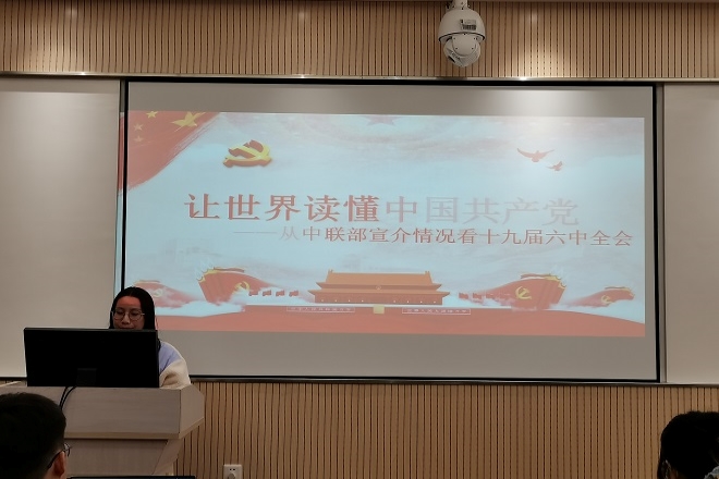 活動第一部分為主題學習——黨的十九屆六中全會精神。全體成員首先集中觀看了黨的十九屆六中全會精神學習視頻,之后,包青、余麗麗、金夏妃、曹玥四位同志就視頻內容從不同角度分享了自己的學習體會。其中,包青同志講道:黨的十九屆六中全會是一場梳理發展歷程、凝心聚力的黨課,黨和國家這一路走來很艱辛,我們現在的成就來之不易;作為一名黨員,今后我們要腳踏實地、發揮先鋒模范作用,踐行好一名共產黨員的職責和使命。黨的十九屆六中全會精神的學習極大促進和增強了與會同學的政治理論學習效果。