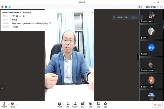 同日晚上,外國語學院黨委副書記劉伯賢召開了2021級本科生會議,劉書記號召大家積極高效地進行線上學習。面對疫情的嚴峻考驗,同學們應服從疫情指揮要求,聽從學校安排,及時測溫上報。他還鼓勵同學們多參加鍛煉,保持良好的體魄和健康的精神狀態。劉書記傳達了學院關于教工黨員聯系宿舍的相關規定,逐一介紹了黨員教工的情況,告知每位學生遇到思想、學業、心理、職涯規劃等問題都可以咨詢宿舍導師,鼓勵學生加強與老師的溝通和交流。