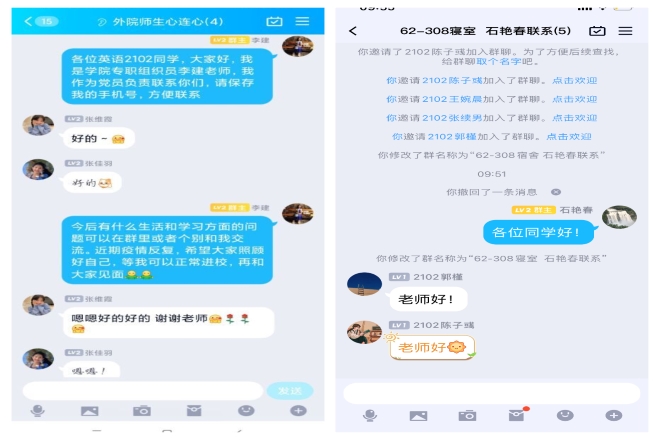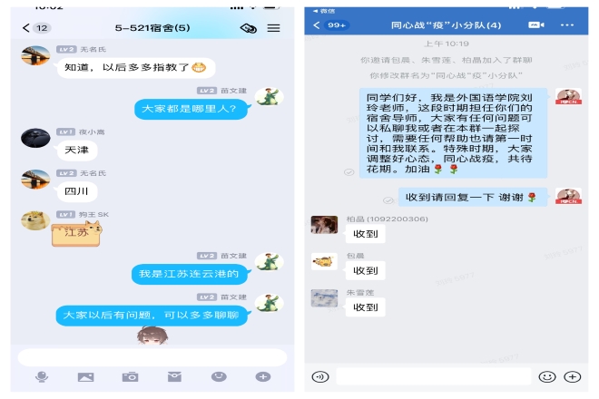 學院教工支部立即召開支部大會,發放聯系清單,向每一位黨員明確本次聯系宿舍工作的職責和要求。當晚,學院48位教工黨員迅速建立了54個包括混合宿舍在內的學生宿舍聯系群,隨即進行了首次線上交流。
