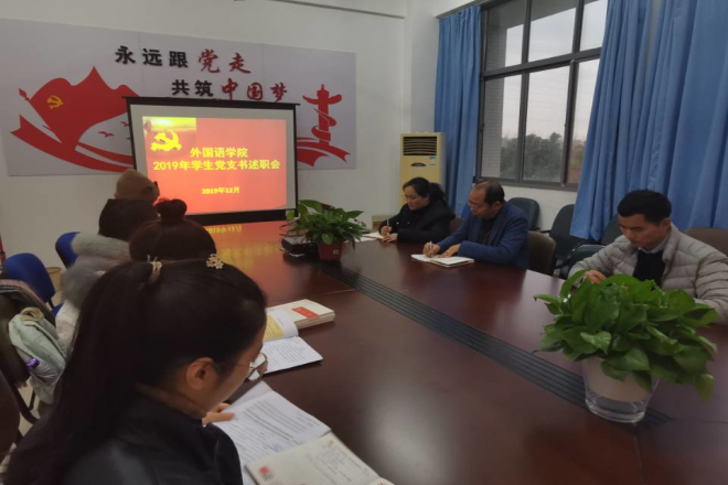 為深入開展“不忘初心,牢記使命”主題教育,全面總結2019年外國語學院學生黨建工作,落實全面從嚴治黨要求,2019年12月18日下午4點,各學生黨支部書記在A425會議室組織進行2019年度學生黨支部書記工作述職工作會議。黨委副書記劉伯賢,分團委書記楊艷,輔導員苗文建出席本次會議。本次會議由黨委副書記劉伯賢主持