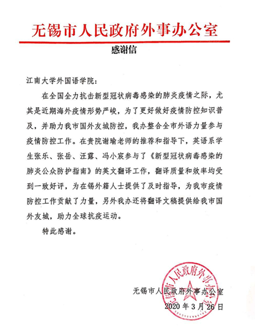 四位同學以嚴謹的態度、科學的精神、高效的質量順利完成了翻譯任務,比原定的時限提前了一半。項目完成后,無錫市政府外事辦專程送來感謝信,以感謝外院師生為無錫市的疫情防控工作所做的積極貢獻。