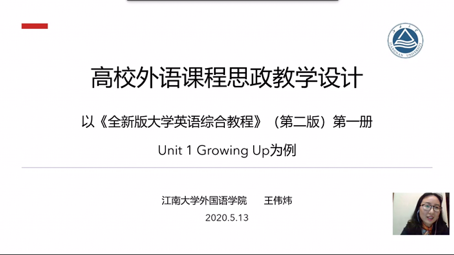 王偉煒老師分享了《全新版大學英語綜合教程》(第二版)第一冊第一單元《成長》的思政教學設計。該設計把思政要點有機地融入到語言教學的各個環(huán)節(jié),通過巧妙細致的課程設計,用正能量潛移默化地引導學生樹立正確的世界觀、人生觀、價值觀。