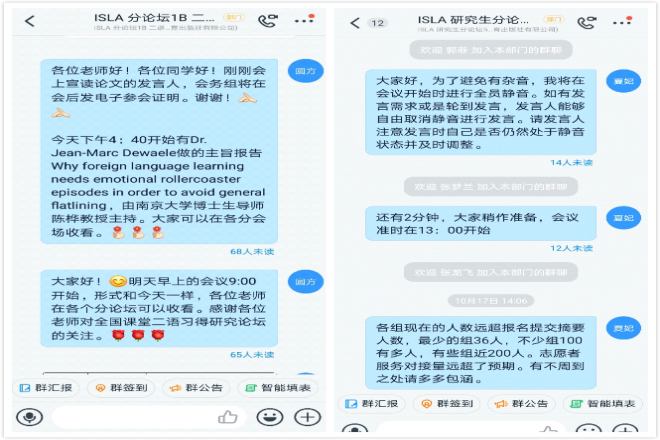 會議正式開始前,每位志愿者在群內發布當天會議流程、主講人以及主講題目;會議正式開始時,由志愿者發起線上會議,輔助主持老師控制會議進程;會議期間,志愿者們及時回復群內各位研究學者的消息,為他們提供幫助,邀請未能進入直播的參會者入群。