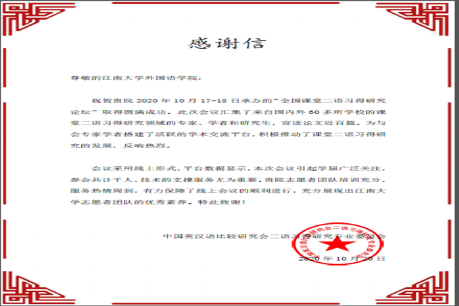 在本次活動期間,志愿者們反應快速,服務到位,充分展現了我院志愿者團隊的優秀素養,積極保障了本次二語習得論壇的順利進行。會議結束以后,各個學校的專家、研究者們向js3333線路檢測中心的志愿者團隊表示感謝。中國英漢語比較研究會二語習得研究專業委員會也向外國語學院發來了感謝信,感謝學院和志愿者團隊的辛勤付出。