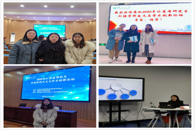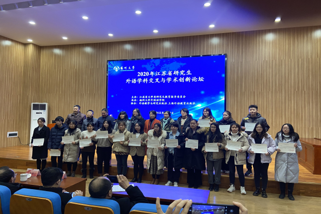 2020年12月19日至20日,江蘇省研究生外語學科交叉與學術創新論壇在揚州大學召開。本屆論壇由江蘇省文學類研究生教育指導委員會主辦, 由揚州大學外國語學院承辦。來自江蘇省及長三角地區20余所高校外國語言文學學科90名博、碩士生與10余位帶隊老師出席了本次學術論壇。我院19級三位研究生向俊蓉,朱春霞,方敏在帶隊老師孫志祥教授的帶領下參加了本次論壇。