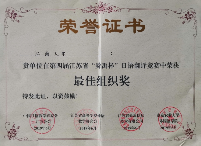據(jù)悉,第四屆江蘇省“舜禹杯”日語翻譯競賽于2019年1月啟動,在控制稿件數(shù)量的前提下,3月底截稿時共收到江蘇省內(nèi)26所高校和省外19所高校寄來參賽譯文共計409篇,其中日譯漢303篇,漢譯日106篇,參賽者均是中文為母語的日語專業(yè)在校大學(xué)生或研究生。4月份經(jīng)過翻譯界專家及評委的匿名評審,共評選出入圍稿件日譯漢30篇、漢譯日10篇。6月1日對入圍同學(xué)進(jìn)行現(xiàn)場加試,在緊張的專家現(xiàn)場評審之后,綜合初賽成績,評選出漢譯日、日譯漢的各級獎項及優(yōu)秀組織獎。由崔明姬老師帶隊,我院參賽隊伍于6月1日前往南京參加在南京農(nóng)業(yè)大學(xué)舉辦的翻譯加試賽。