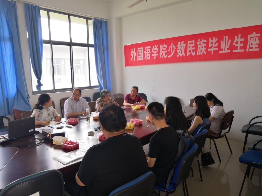 為更進一步關(guān)心2019屆少數(shù)民族學(xué)生的學(xué)習(xí)、就業(yè),幫助少數(shù)民族學(xué)生成長成才,6月11日下午,外國語學(xué)院在A425會議室召開了2019屆少數(shù)民族畢業(yè)學(xué)生座談會,我院畢業(yè)班少數(shù)民族學(xué)生參加了會議。院黨委副書記劉伯賢、關(guān)工委張曉虹、鮑國慶、吳艷敏等老同志出席了會議。