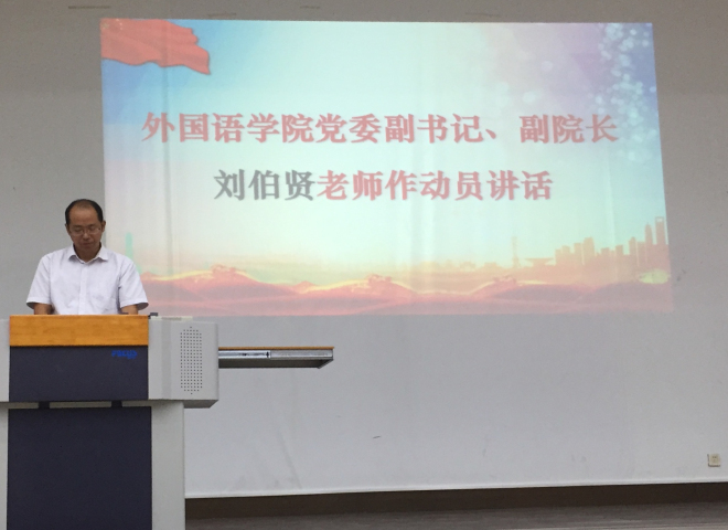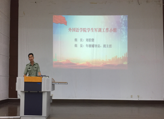 外國語學院2019級新生軍訓動員大會于2019年9月1日上午8:30在第一教學樓1C109舉行。學校人武部軍事訓練科科長韋紅武老師,外國語學院黨委副書記、副院長劉伯賢老師,19級新生輔導員苗文建老師,18級軍訓優秀學員以及19級全體新生參加會議。本次大會由輔導員苗文建老師主持。
