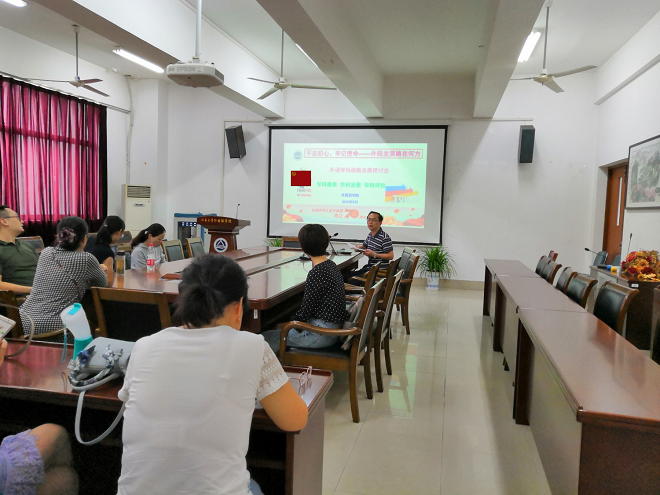 方文開副院長首先傳達了“不忘初心、牢記使命”主題教育的重要意義、學校第四次黨代會與發展戰略研討會的主要精神,隨后做了《外國語學院學科發展思路思考》的主題報告,進而與會老師暢所欲言,各抒己見,開展了熱烈、深入的交流與研討。
