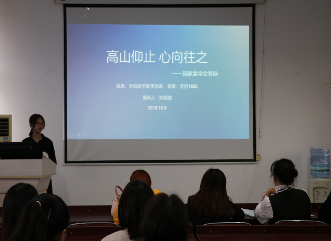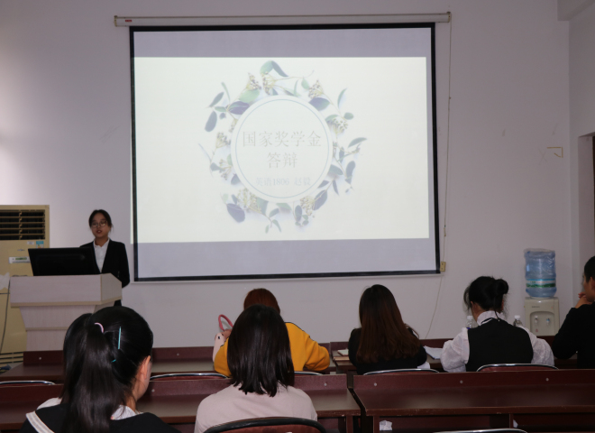 本次本科生國(guó)家獎(jiǎng)學(xué)金評(píng)選經(jīng)系統(tǒng)申報(bào)、學(xué)院初評(píng),共有17名候選人進(jìn)入現(xiàn)場(chǎng)評(píng)審環(huán)節(jié)。答辯會(huì)現(xiàn)場(chǎng)分為自我陳述和評(píng)委提問(wèn)兩個(gè)環(huán)節(jié)。在自我陳述環(huán)節(jié),各候選人通過(guò)圖文并茂的PPT展示,圍繞專(zhuān)業(yè)學(xué)習(xí)、綜合素質(zhì)測(cè)評(píng)以及愛(ài)好特長(zhǎng)等方面陳述著各自的參評(píng)理由。經(jīng)過(guò)評(píng)委現(xiàn)場(chǎng)打分,加上學(xué)年學(xué)業(yè)成績(jī)、綜合素質(zhì)測(cè)評(píng)成績(jī)以及現(xiàn)場(chǎng)表現(xiàn)的綜合評(píng)定后,最終確定16級(jí)英語(yǔ)專(zhuān)業(yè)左銘瑤、17級(jí)日語(yǔ)專(zhuān)業(yè)倪心喆等8名同學(xué)獲得2018—2019學(xué)年本科生國(guó)家獎(jiǎng)學(xué)金榮譽(yù)。國(guó)獎(jiǎng)評(píng)選答辯會(huì)不僅是學(xué)生一次展示的機(jī)會(huì),更是一次難得的學(xué)習(xí)機(jī)會(huì)。
