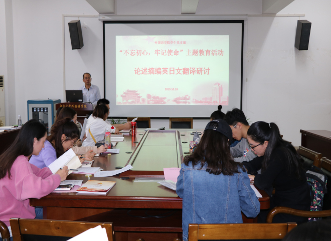 10月18日下午,外國語學院學生黨支部開展了“不忘初心、牢記使命”主題教育英日文翻譯研討會,學生黨支部全體黨員參加了此次主題教育活動。