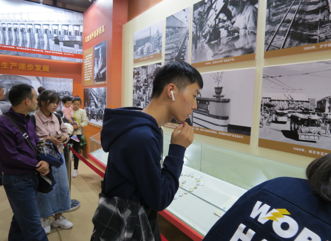 隨后步入室內(nèi)展區(qū),在一幅幅照片、一段段視頻、一個個實物場景展示前,每位黨員同學(xué)駐足仔細(xì)觀看,充分感受江蘇70年來的巨大變化、重大成就。本次成就展通過綜合展、地方展和室外展3個展區(qū),綜合運用場館展覽、網(wǎng)上展覽、掛圖展示等形式,展出圖片(圖表)2000多張,實物、模型、沙盤100多件(套),視頻及多媒體展品100多件(套),展列228個先進(jìn)典型和英雄模范人物(集體)。同學(xué)們在題為“太湖明珠 江南盛地”發(fā)展變遷的無錫展館里認(rèn)真觀看、合影留念。