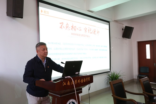 根據(jù)學校“不忘初心、牢記使命”主題教育的統(tǒng)一部署,10月29日下午,校黨委常委、副校長徐巖來到外國語學院,為學院師生黨員上了題為《不忘初心、砥礪前行,以“雙一流”建設推進學科發(fā)展》的專題黨課,學院黨政領導、英語系、日語系教師黨員和學生黨員代表等30多人現(xiàn)場聆聽。