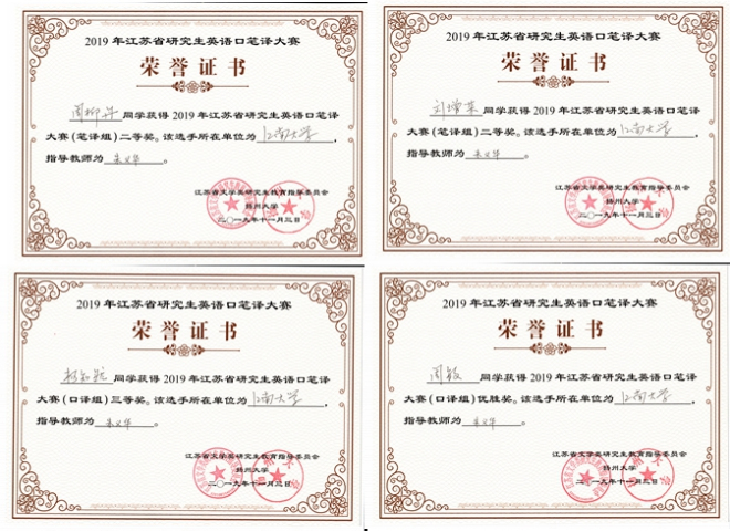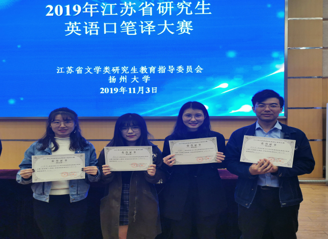 2019年江蘇省研究生英語口筆譯大賽于2019年11月2日至3日在揚州大學隆重舉行。外國語學院四名研究生在朱義華老師的帶領(lǐng)與指導下充分發(fā)揮自身優(yōu)勢,經(jīng)過層層選拔與激烈角逐在比賽中取得優(yōu)異成績:我院18級研究生周柳丹、劉增榮雙雙獲得筆譯組二等獎,18級研究生楊知然獲得口譯組三等獎,19級研究生周敏獲得口譯組優(yōu)勝獎。