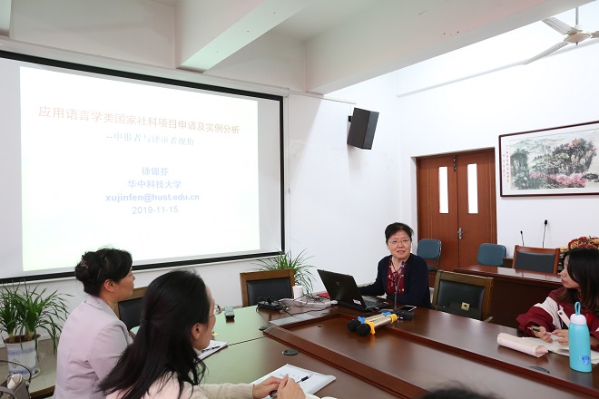 11月15日下午,2019外語學科系列講座第十一期在外國語學院A349開講。本次講座由華中科技大學外國語學院二級教授,博士生導師徐錦芬老師主講,講座的主題是:應用語言學類國家社科項目申請及實例分析。參與本次專題講座的有從事英語教學、二語習得研究的教師和各年級研究生,講座現(xiàn)場氣氛熱烈,座無虛席。