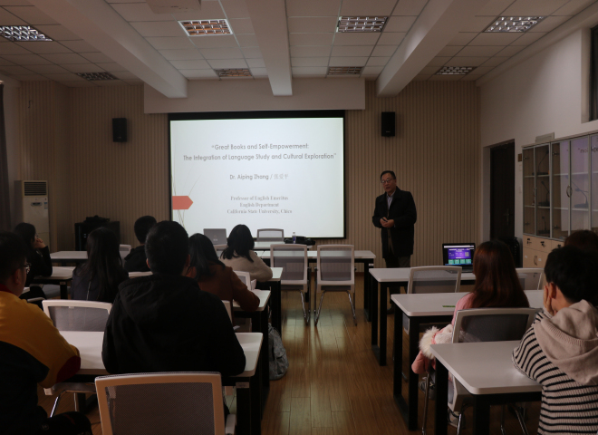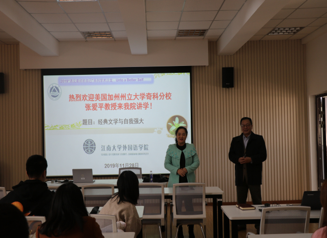 11月28日下午13:30,外語(yǔ)學(xué)科系列講座暨第七期“遇見(jiàn)更好的自己”名師沙龍活動(dòng)在學(xué)院A529準(zhǔn)時(shí)召開(kāi)。講座的主講人是來(lái)自美國(guó)加州州立大學(xué)奇科分校英語(yǔ)系榮休教授張愛(ài)平,本次講座的主題是:經(jīng)典文學(xué)與自我強(qiáng)大。參加本次沙龍活動(dòng)的有本科生和研究生,講座由分團(tuán)委書(shū)記楊艷老師主持。