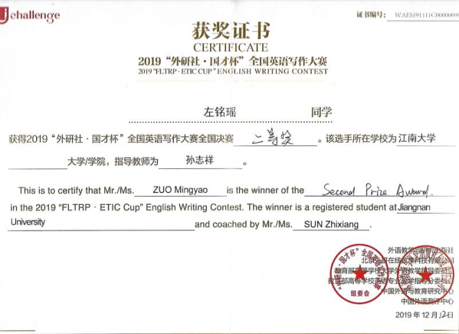 12月13日,2019“外研社·國才杯”大學(xué)生英語挑戰(zhàn)賽(Uchallenge)于北京落幕。我校外國語學(xué)院左銘瑤同學(xué)榮獲全國英語寫作大賽總決賽二等獎。