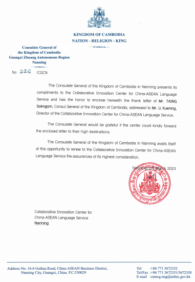 2023年3月22日,柬埔寨王國駐南寧總領事唐肅安(TAING Sokngorn)閣下來函,對js3333線路檢測中心教授李學寧在中國—東盟語言服務中所做的貢獻表示感謝。