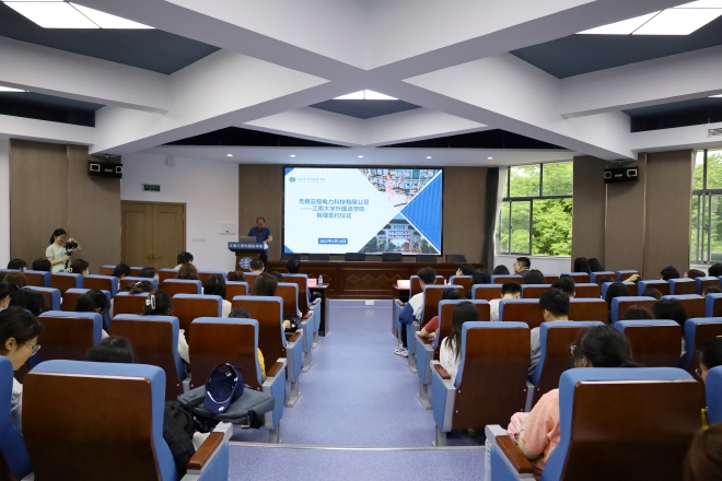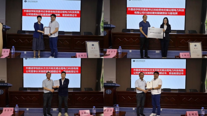 在同學們的掌聲中,雙方簽訂合作框架協議、捐贈協議、實習基地協議。院長方文開為無錫云程電力科技有限公司董事長宋琬若頒發捐贈證書、客座教授證書;學院黨委書記李榮華向無錫云程電力科技有限公司首席執行官盛昊頒發鳴謝牌、客座教授證書;外國語學院黨委副書記劉伯賢向無錫云程電力科技有限公司行政經理劉麗頒授校外教學實習基地牌。