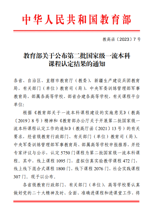 近日,教育部公布了第二批國家級一流本科課程名單。根據教高函〔2023〕7號《教育部關于公布第二批國家級一流本科課程認定結果的通知》,我院《高級英語(1)》在線課程獲評第二批國家級一流本科線上課程認定。