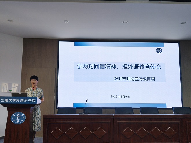 李榮華書記以“學兩封回信精神,擔外語教育使命”為題,開啟了學院師德教育宣傳周系列教育活動。李書記帶領大家重溫了習近平總書記給北京外國語大學老教授的回信和習近平總書記給外文出版社的外國專家的回信,勉勵教師們努力培養有家國情懷、有全球視野、有專業本領的復合型外語人才,履行外語人使命擔當,做好中華文化外譯和外宣,促進學院奮進發展。